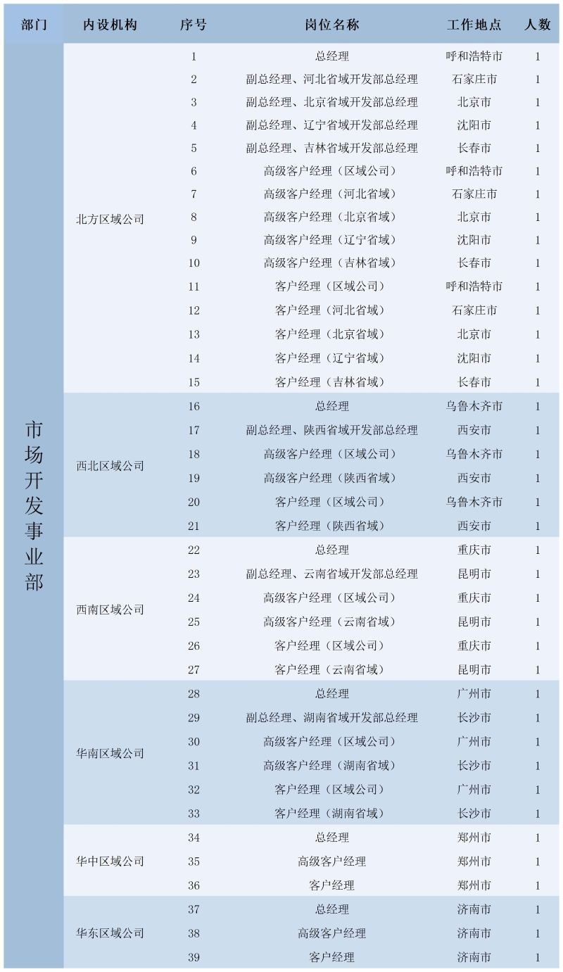 公司市场开发事业部是制定公司市场经营战略与营销策略、市场政策形势分析、市场系统统筹建设、市场开发规划编制和实施、市场开发制度体系建设、市场信息化建设、市场区域布局、国内国际分支机构市场开发管理、项目立项审批管理、高端客户维护的职能机构;是公司新商业模式类、重点和大型项目跟踪策划、模型建立、合同谈判的主体机构。根据市场开发事业部工作需要,现面向社会公开招聘市场开发事业部区域公司管理岗位,有关事项公告如下: