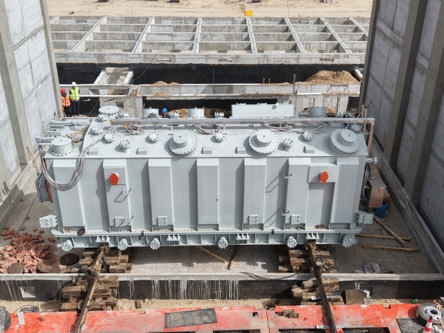 此次就位的主变压器属于项目的“核心心脏”,其长 10.05米、宽3.37米、高3.65米,重达160吨。面对设备体积庞大、安装精度要求高的双重挑战,项目团队超前部署、科学谋划,通过实地勘察、精准测算,精心规划运输路线并制定详尽的保障方案。过程中,施工团队凭借丰富经验与精湛技术,借助千斤顶等专业设备,严格沿既定轨道稳步移动主变压器。在各环节工作人员的紧密配合下,主变压器精准落位,标志着项目正式迈入设备安装攻坚阶段。